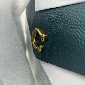 Gold tone hardware of large Signature Coach 'C' with an engraved detail with multi color stones (gives a bit of a midwestern vibe)