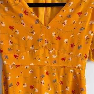 Vibrant mustard dress with delicate floral design. Features a V-neck and zipper closure.