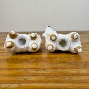 Add charm to your table or shelf with this sweet pair of vintage ceramic lamb salt and pepper shakers. Hand-painted with soft golden tan accents and expressive little faces, these collectible shakers bring warmth and whimsy to farmhouse, cottagecore, or pastoral-style decor.