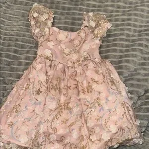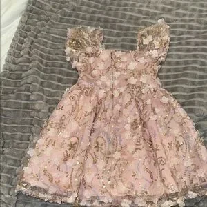 Adorable pink kids dress with sparkling gold accents. Perfect for special occasions. Mesh sleeves. 3d floral design. Worn for an hour !