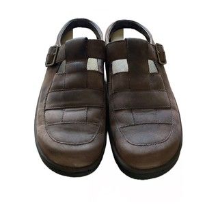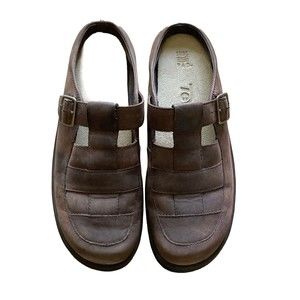 Stylish brown mules with buckle detail. Comfortable and versatile.