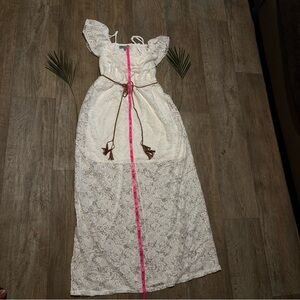 The dress in the image is a white lace maxi dress from the brand Bailey Blue.
