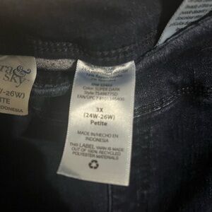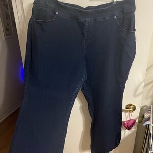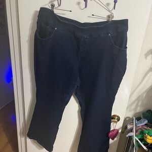 Comfortable and stretchy dark blue pull on jeans. Ideal for everyday wear. These could fit a 4X. They are a 3X 24/26 Petite, and stretchy. Wider leg. This shade is my favorite I love how dark and sleek it is!