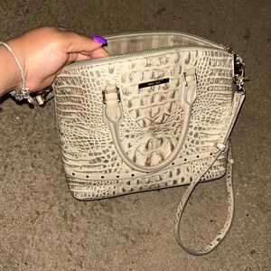This cream satchel from Brahmin showcases a luxurious crocodile-embossed texture, offering a sophisticated and timeless appeal. Its structured design and detachable shoulder strap make it a versatile choice for everyday elegance.