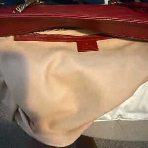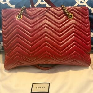 This luxurious Gucci shoulder bag showcases a striking red leather with a distinctive chevron quilting pattern. Adorned with gold-tone hardware, including the iconic GG logo, it features a decorative chain strap for a touch of elegance. The bag's structured design and vibrant color make it a standout accessory for any occasion. Used only twice as seen in the pictures in good condition no odor has a zipper on top. Clean suede lining inside. Comes with dust bag. Large tote always in style.