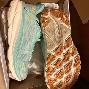 Step into comfort and style with the Hoka Women’s Clifton 9 Seafoam color Athletic Shoes. These are in decent condition and are size 8.5 Wide.