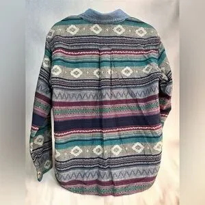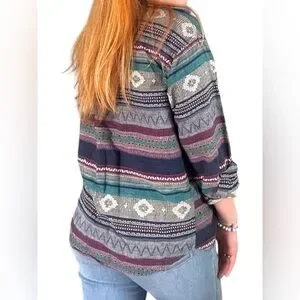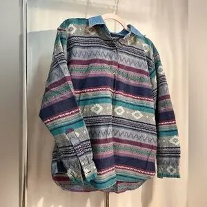 This Vintage “One Company” Southwestern Button Up Long Sleeve Shirt is a chic and versatile women's shirt designed in a size that fits small to medium. This shirt embodies a Southwestern aesthetic, often characterized by vibrant colors, geometric patterns, and intricate designs that reflect the rich cultural heritage of the region.