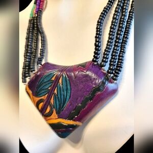 Vintage Art to Wear Abstract Funky Carved Wood Pendant Beaded Statement Necklace
