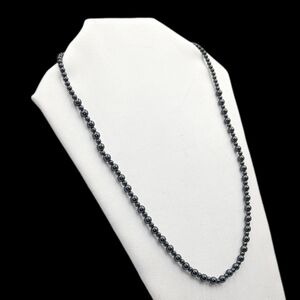 This exquisite dark gray necklace features a single strand of uniformly-sized beads, creating a sleek and sophisticated look. The beads' subtle sheen enhances its elegance, making it a versatile piece for any occasion. Its mid-chest length design ensures it stands out beautifully against any attire.