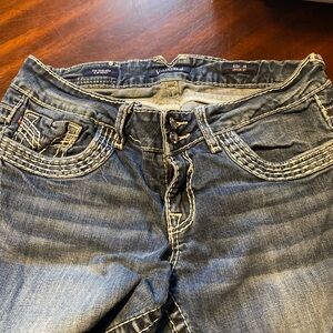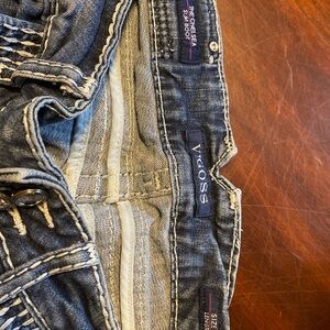 I altered the bottom of these so they do not flair at the bottom. These Vigoss jeans feature a medium-dark blue wash with a vintage-inspired worn look, highlighted by distinctive decorative stitching in a 'V' pattern. The ankle-cropped design and slim fit offer a modern silhouette, perfect for casual outings. I altered the bottom of these jeans so they do not flair.