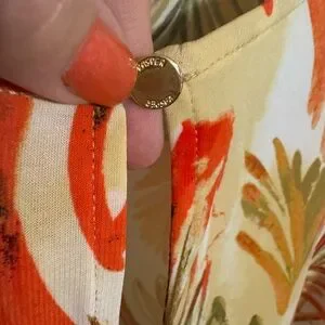 This Kasper top features a vibrant blend of orange and gold in a tropical leaf print, enhanced by 3/4 sleeves for a stylish touch.