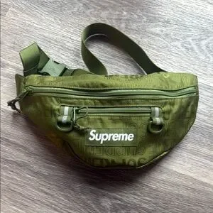 This Supreme belt bag in a striking green hue combines streetwear flair with practical design. Its adjustable strap ensures a comfortable fit, making it an ideal accessory for on-the-go convenience.