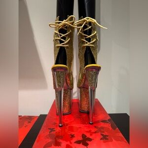 SOLD OUT EVERYWHERE. Pleaser Flamingo 1018G Size 7 8" Heel, 4" PF Glitter Lace-Up Back Ankle Boot, Side Zip Open Toe. Comes with box and original packaging. Platform was protected by Pole Bites Platform cover. Not part of the sale but can be included as a gift upon request.