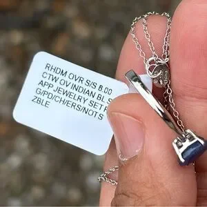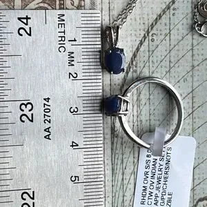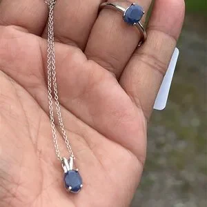 This is for an elegant set of ring, necklaces and pendants with genuine natural blue sapphires in solid sterling silver. These are unused. The chain is 18 inches long, and the ring is a size 8, sizable. These stones are on the lighter side, and they are not very transparent.