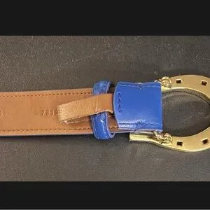 The Lauren Ralph Lauren RLL Blue Leather Horseshoe Buckle Women's Belt in size M is a stylish and versatile accessory for women. Made from high-quality leather featuring a unique horseshoe buckle, this belt exudes an equestrian-inspired charm. The brass hardware adds convenience to the design, making it a practical yet fashionable choice for everyday wear or special occasions. The classic blue color and renowned Ralph Lauren brand ensure that this belt is a timeless and chic addition to any wardrobe.