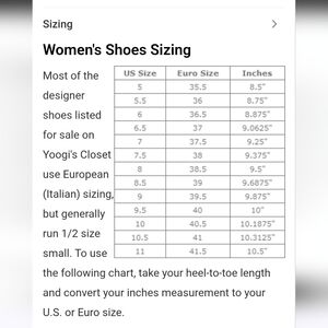 European (Italian) sizing, but generally run 1/2 to 1 size small. To use the following chart, take your heel-to-toe length and convert your inches measurement to your U.S. or Euro size.