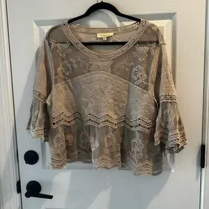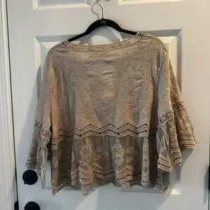 This relaxed, boxy blouse by Rebellion showcases a tan hue with ruffled 3/4 sleeves, offering a bohemian flair. The lightweight fabric and intricate lace detailing make it perfect for layering or wearing on its own during warmer months.