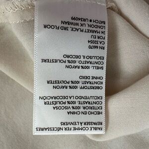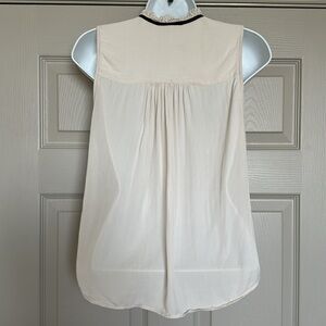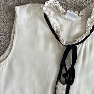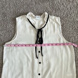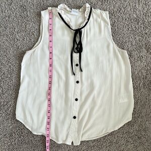 Elegant sleeveless top featuring a classic white design with black button and tie accents. Perfect for a chic and sophisticated look.