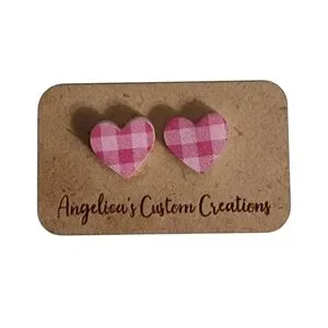 Add a touch of sweetness to your everyday style with these charming pink plaid heart stud earrings from Angelica's Custom Creations. Each pair features adorable heart-shaped wooden studs decorated with a delicate pink and white gingham pattern that offers a perfect blend of rustic charm and feminine flair. Lightweight and comfortable for all-day wear, these handcrafted earrings make an ideal accessory for casual outfits or adding a playful accent to your professional attire. Mounted on eco-friendly kraft backing, these unique studs arrive ready for gifting.