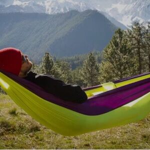Grand Trunk Double Parachute Hammock in vibrant purple & yellow. Made from double parachute nylon.