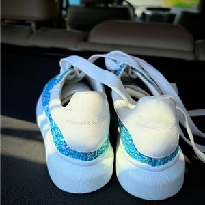 Dazzling blue glitter sneakers with white soles and laces. Perfect for adding sparkle to any outfit. Kids have a few scuffs on the white part of sneaker in the back but can be covered with white shoe polish.