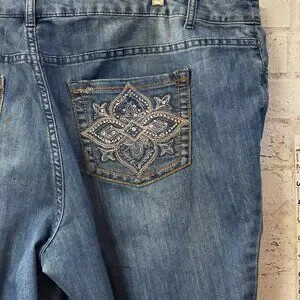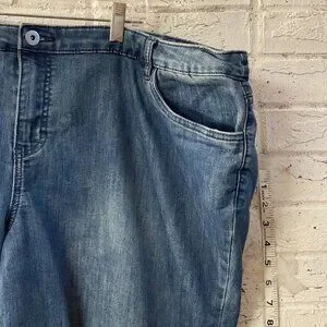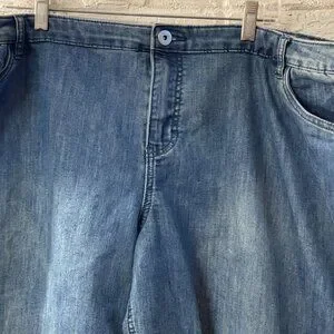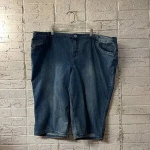 Get ready to rock your summer look with these CJ Banks Denim Bermuda Shorts in a size 24W. Designed for comfort and style, these shorts feature beautifully embellished back pockets for a touch of sparkle. The classic denim wash and relaxed fit make them perfect for any casual outing. Wear them with your favorite tee for a laid-back vibe or dress them up with a blouse for a chic, effortless look.