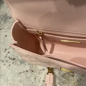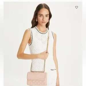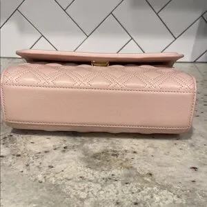 The Tory Burch Pink Quilted Crossbody Bag showcases a luxurious quilted leather design with a diamond pattern, complemented by a versatile gold-tone chain strap. Its structured rectangular shape and elegant flap closure make it a timeless accessory for any occasion. The leather is scratch resistant similar to caviar leather texture.