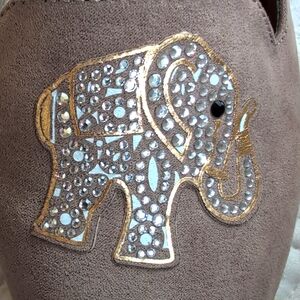 These elegant taupe gray flats feature a sophisticated loafer design with a comfortable rounded toe. The light gray suede uppers are adorned with a delicate, glittering rhinestone elephant outlined in a sparkling gold embroidered crest, adding a touch of whimsy to any outfit.