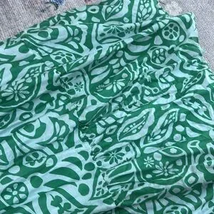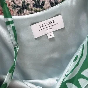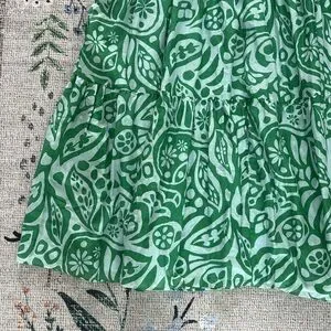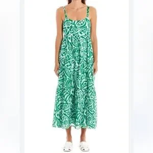 This sleeveless sundress by La Ligne features a vibrant green and white botanical print, perfect for resort wear. The spaghetti strap neckline and tiered maxi length create a flowing silhouette ideal for casual, warm-weather outings.