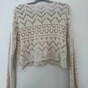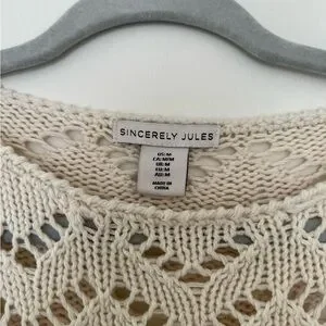 This cream sweater from Sincerely Jules (from Macys) features a beautiful crew neck design with an intricate knit pattern. The lightweight material and length make it perfect for layering, while the geometric and lacey elements add a touch of bohemian charm.