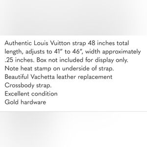 from original seller - Authentic Louis Vuitton strap 48 inches total length, adjusts to 41" to 46", width approximately .25 inches. Box not included for display only.
