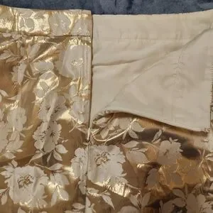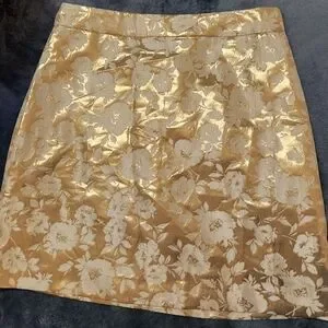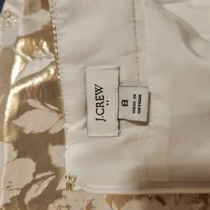 This stunning mini skirt from J. Crew features a luxurious gold and cream color scheme, perfect for a cocktail night out. The A-line silhouette is beautifully embellished, adding a touch of elegance and sophistication. Its structured design ensures a flattering fit, making it a standout piece for any special occasion. Skirt length about 20in