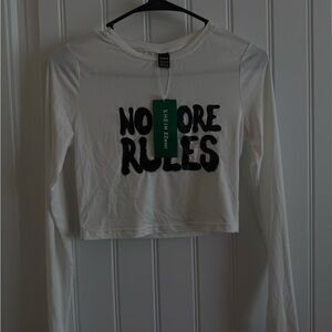 (Never Worn) This trendy No More Rules long sleeve crop top is the perfect addition to any wardrobe! Featuring a bold and rebellious slogan, this top is designed to make a statement. The cropped length pairs effortlessly with high-waisted jeans, skirts, or leggings for a stylish look. Crafted from soft, comfortable fabric, it's perfect for layering or wearing on its own. Whether you're dressing up for a casual day out or lounging at home, this top is a must-have!
