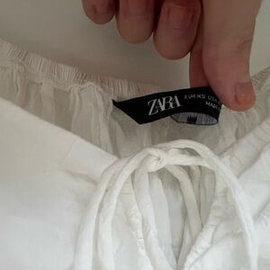 This elegant Zara blouse features a charming puff sleeve design with a tie front and ruffled details. Crafted in a bright white hue, it offers a cropped silhouette perfect for a chic, romantic look.