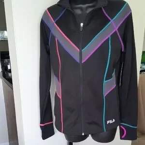 BRAND NEW WITH TAGS! This Fila jacket showcases a striking black base with dynamic teal- purple- blue- pink chevron stripes, offering a modern and sporty look. Crafted from a stretchy performance fabric, it features a full-length zipper and long sleeves with coordinating stripe details, ensuring both style and comfort.