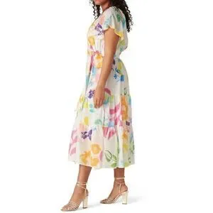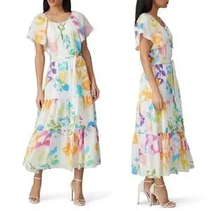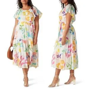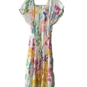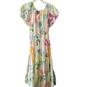 Tanya Taylor Ella Floral Rainbow Dress Silk Midi Flutter Sleeve Size 4