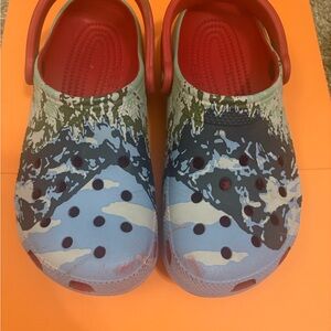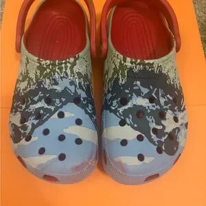 Experience the perfect blend of style and comfort with these CROCS sandals, featuring a captivating mountain landscape design on a light blue upper and a deep red sole. The signature ventilation holes and adjustable strap offer versatility and breathability, making them ideal for casual outings. Crafted from durable rubber/foam material, these sandals ensure a comfortable fit for all-day wear.