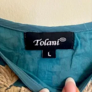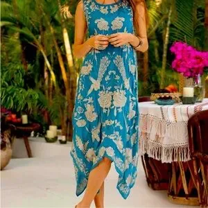 Tolani "Trianta dress" is elaborately embroidered in cream on a lovely teal blue ground with swingy, asymmetrical handkerchief hemline and easy-fit style. Cupro fabric with cotton lining. wash. P-2-P approximately 21”, Length approximately 52”. In excellent condition with no issues. From Sundance catalog.