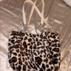 Stylish and chic leopard print faux fur tote bag featuring elegant white straps. Perfect for adding a touch of wild sophistication to any outfit.