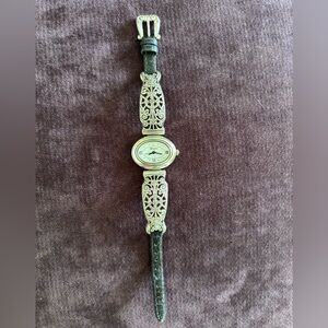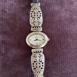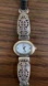 Elegant silver wristwatch with ornate band design. Perfect for any occasion.