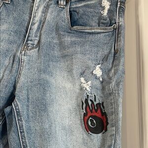 Elevate your style with these blue distressed jeans featuring unique graphic designs. Perfect for a bold, casual look.