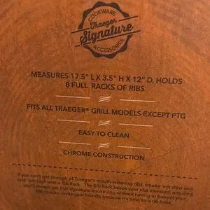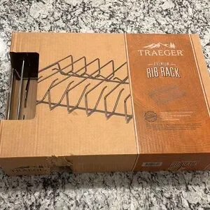 New in box. Traeger rib rack, crafted to hold multiple ribs for efficient cooking. Its wire frame design ensures optimal heat and smoke circulation, delivering perfectly cooked ribs every time. A must-have serveware piece for barbecue enthusiasts. Size is 17.5” L x 3.5” H x 12” D holds 8 full racks of ribs. Fits all Traeger grills except PTG model. Chrome construction.
