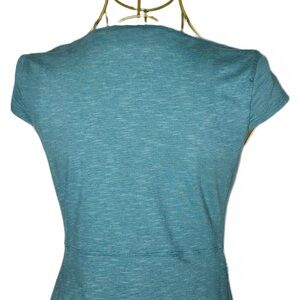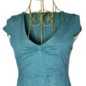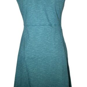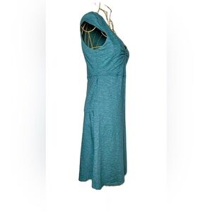 Toad & Co The Rosemarie Dress in Heathered Blue/Green with a Sweetheart V-Neckline, Cap Sleeves, Double-Layer Bodice, Horizontal Bust Pleats, Empire Seam, A-Line Drape, and Zippered Pocket on Right Hip for Keys, Phone, etc. Stretchy, Size XS.