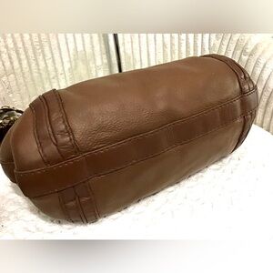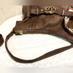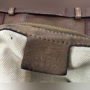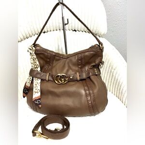 This Gucci shoulder bag features a luxurious brown leather construction with elegant gold-tone hardware, including the iconic GG logo. Its hobo-style design offers a relaxed yet sophisticated look, perfect for everyday use.