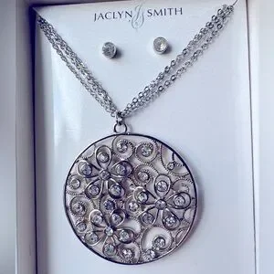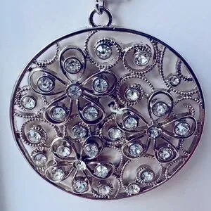 The Jaclyn Smith Silver Necklace showcases a stunning circular pendant with intricate scrollwork and sparkling rhinestone accents, exuding a romantic Victorian charm. Hanging from a triple-strand silver chain, this piece is a timeless addition to any jewelry collection. Pet/smoke free home.