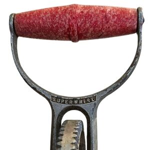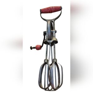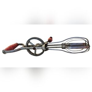 Classic handheld egg beater with a vibrant red handle. Perfect for adding a retro touch to your kitchen.