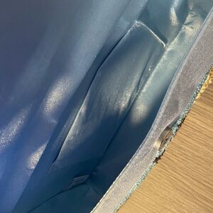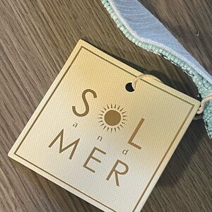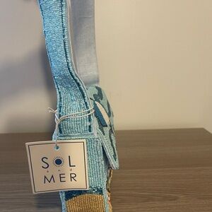This Sol and Mer shoulder bag showcases a delightful beach scene with intricate embroidery, featuring waves and a sandy beach. The blue and tan colors evoke a coastal charm, making it a perfect accessory for casual outings.