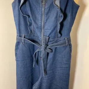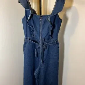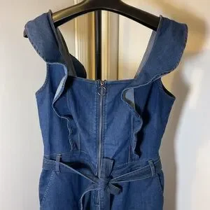 Embrace a blend of classic and contemporary with this Tinseltown jumpsuit, crafted from dark blue denim. The wide-leg palazzo style and square neckline with ruffle cap sleeves offer a relaxed yet sophisticated silhouette. A tie belt at the waist enhances the overall chic appeal.