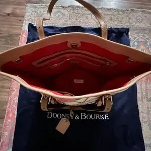 Bright, beachy, and super fun! This rare Dooney & Bourke tote features a coated canvas exterior with a limited-edition flamingo and palm tree print — perfect for summer, vacations, or collectors.