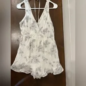 Chic romper with textured gray floral patterns. Soft and stylish.